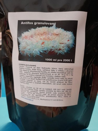 Použití : použijte asi 50 ml na každých 100 litrů vody (podle naměřené hodnoty PO4). Antifos umístěte do filtru tak, aby jím voda pomalu protékala. Rychlý průtok vody znamená menší účinnost. Můžete jej umístit např. do jemné síťoviny do filtru anebo – lépe do speciálního průtokového filtru, který je konstruován pro tento účel.