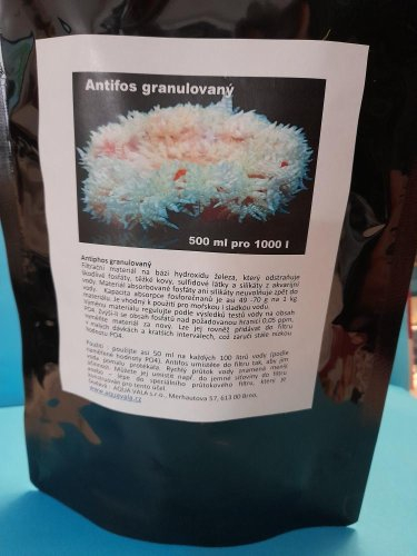 Použití : použijte asi 50 ml na každých 100 litrů vody (podle naměřené hodnoty PO4). Antifos umístěte do filtru tak, aby jím voda pomalu protékala. Rychlý průtok vody znamená menší účinnost. Můžete jej umístit např. do jemné síťoviny do filtru anebo – lépe do speciálního průtokového filtru, který je konstruován pro tento účel.