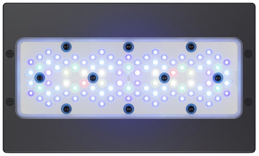 Jeden cluster s geometrickým umístěním LED pro zlepšení šíření a míchání barev. Rovnoměrná distribuce PAR snižuje hot-spoty a prospívá zdraví korálů.