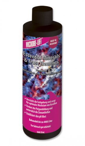 Nově vyvinuté patentované složení doplňuje velmi důležité minerály a stopové prvky vyčerpané filtrací, živočišné absorpcí a činností odpěňovače. Přírodní mořská voda obsahuje více než 70 základních a stopových prvků. Tento přípravek snadno doplní všechny potřebné prvky a díky přidanému bufferu udržuje rovnováhu pH. Pomáhá udržovat kvalitu a přirozené složení vody pro ryby, korály a bezobratlé.