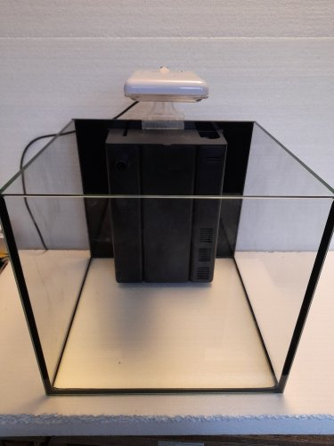 je sestava akvária bez mořských kamenů, mořské vody a písku. Součástí je osvětlení LED lampička na hranu akvária s bílým a modrým světlem, určená pro mořská akvária.
