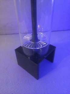 Jednoduché řešení, úspora místa - čerpadlo je integrované pod filtrační válec do kvádrové podstavy z černého acrylu. Filtr zabere plošně místo pouze 120x120 mm. Voda přepadá přes horní hranu, kde se po povrchu válce znovu okysličuje (což je výhoda).