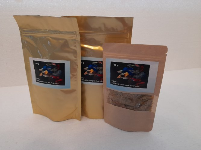 Vločkové krmivo od firmy Vitalis Anglie, složené z několika druhů vloček pro správnou výživu živorodek.